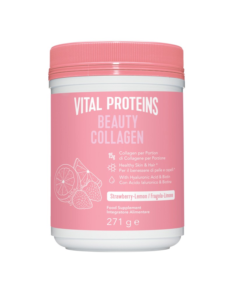 Peptidi di collagene bovino, fragola disidratata (7,5%), inulina, aromi, succo di limone disidratato (2,4%), acqua di cocco disidratata, ialuronato di sodio, biotina.