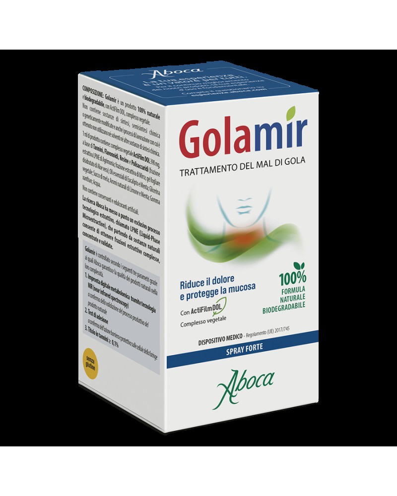 Golamir è un dispositivo medico indicato nei casi di mal di gola per il trattamento degli stati irritativi e infiammatori del cavo orofaringeo, che possono essere causati da virus, batteri, allergeni o dal contatto con agenti esterni irritanti (fumo, smog, polvere). Il prodotto è adatto anche negli stati di raffreddamento dove le secrezioni nasali, scendendo nella gola, possono essere causa di irritazione.