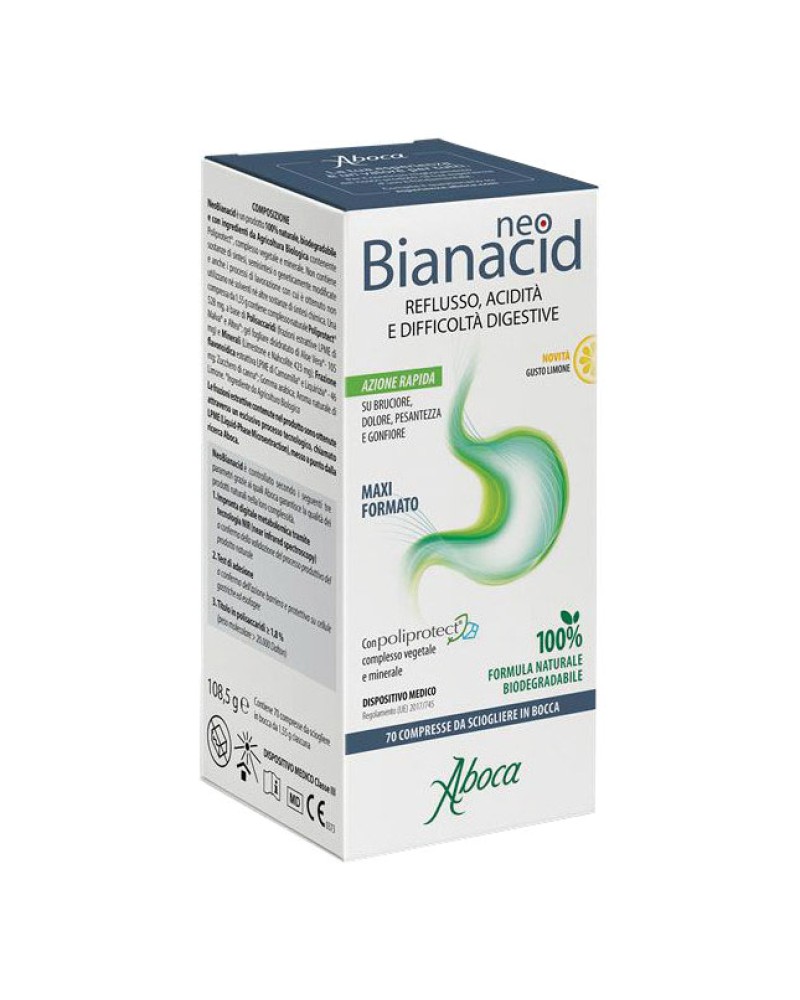 Indicato per il trattamento del reflusso gastroesofageo e del dolore di stomaco (dispepsia dolorosa), caratterizzati da rigurgito acido, bruciore, dolore, tosse irritativa, disfonia. NeoBianacid è indicato anche nel trattamento dei sintomi associati a difficoltà di digestione (dispepsia non dolorosa), quali acidità, pesantezza e gonfiore dopo i pasti, sia ricorrenti che in caso di eccessi alimentari. NeoBianacid può essere utile in prevenzione, nelle situazioni che provocano irritazione della mucosa (ad esempio assunzione di farmaci antinfiammatori o periodi di stress psico-fisico). Il prodotto è adatto anche all’uso in gravidanza, durante l’allattamento e nei bambini sopra i 6 anni.